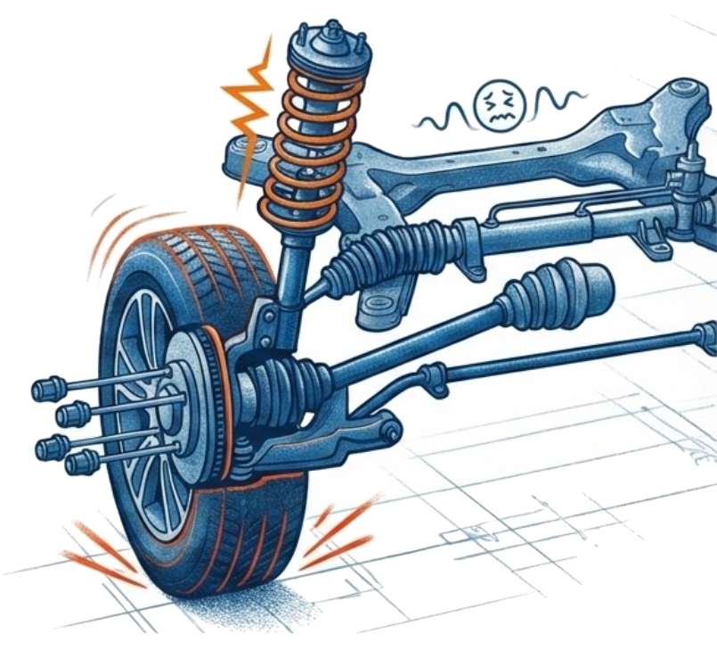 • Los propios brazos, bujes y articulaciones de suspensión que conectan las ruedas al chasis.