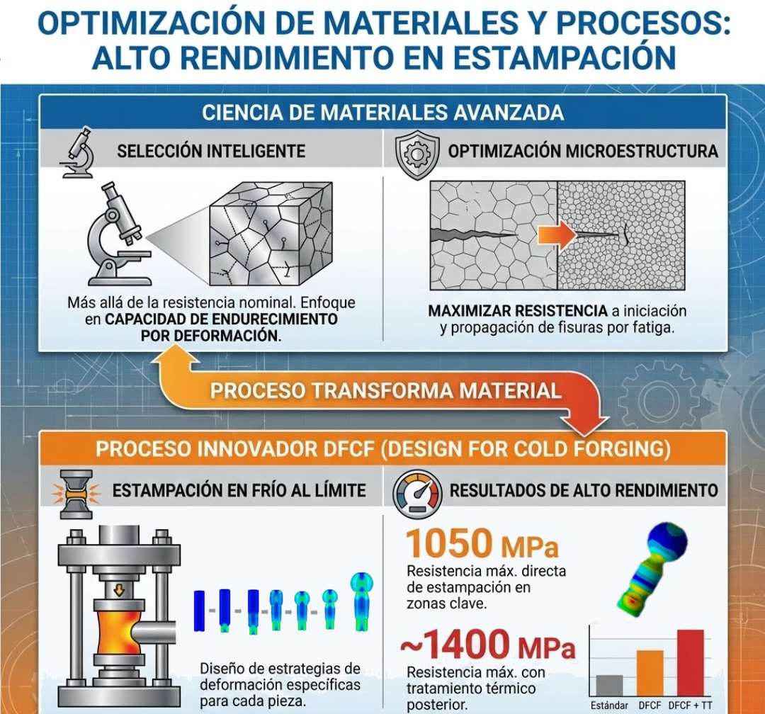 • Generando procesos que aúnan el Cold Forging con ciclos de tratamiento térmico que eleven el rendimiento de los productos hasta lograr valores cercanos a los 1.400 MPa de resistencia.
